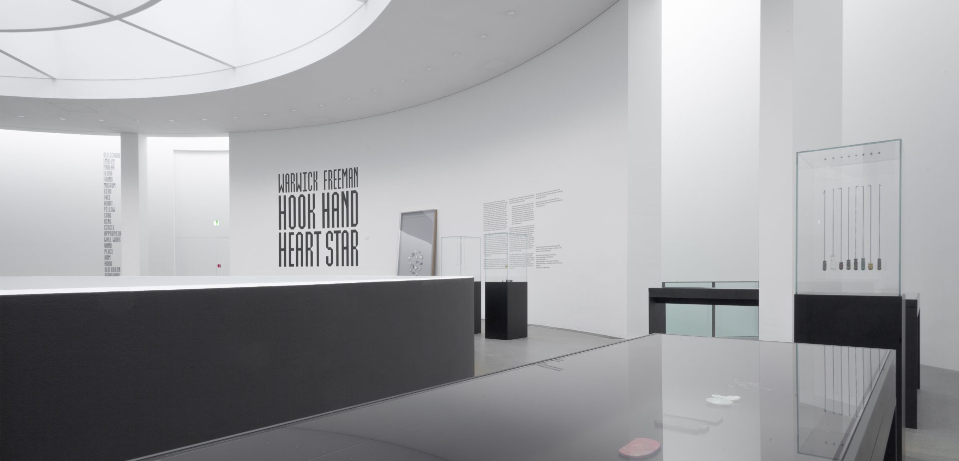 Hook Hand Heart Star – Die vier Nomen, die den Titel der Ausstellung in München bilden, sind inspiriert von Freemans erster Zusammenstellung solch zeichenhafter Arbeiten aus dem Jahr 1987: Fern Fish Feather Rose / Farn Fisch Feder Rose, die sich heute in der Sarjeant Gallery Te Whare o Rehua Whanganui befinden. Dieses Werk war für ihn der Anstoß, über die Kraft der Komposition von Zeichen und Formen nachzudenken, die anstelle von Worten dank ihrer emblematischen Lesbarkeit ihre Geschichten vermitteln.