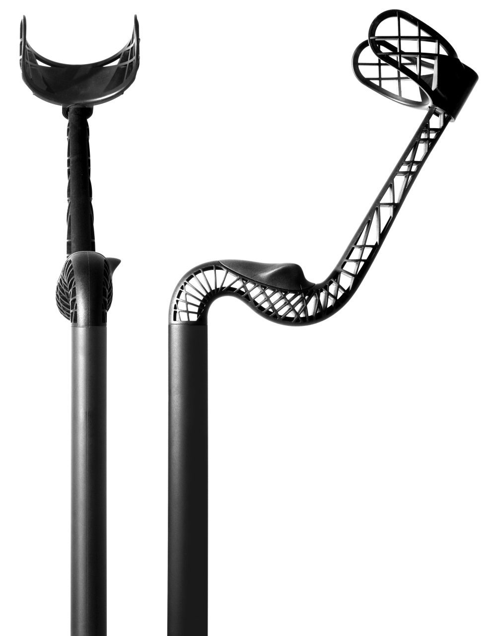 These two ergonomic walking aids have a skeleton-like grip surface, which is significantly more stable and at the same time lighter than other walking aids due to its struts. The design of the Ganymed crutches also differs significantly from conventional walking aids. For example, the design of the rubber foot, which can be rotated 180 degrees, is unique. The advantage of this rotating function is to allow a softer or harder contact point.