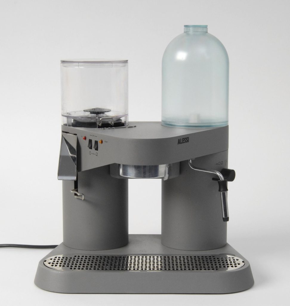 Richard Sapper hat diese Espresso-Maschine entworfen. Die Espresso-Maschine ist von der Firma Alessi. Alessi hat die Espresso-Maschine ab 1998 produziert. Das ist besonders an der Espresso-Maschine: • der Kaffee-Behälter und der Wasser-Behälter sind rund • der Kaffee-Behälter und der Wasser-Behälter sind oben an dem Gerät