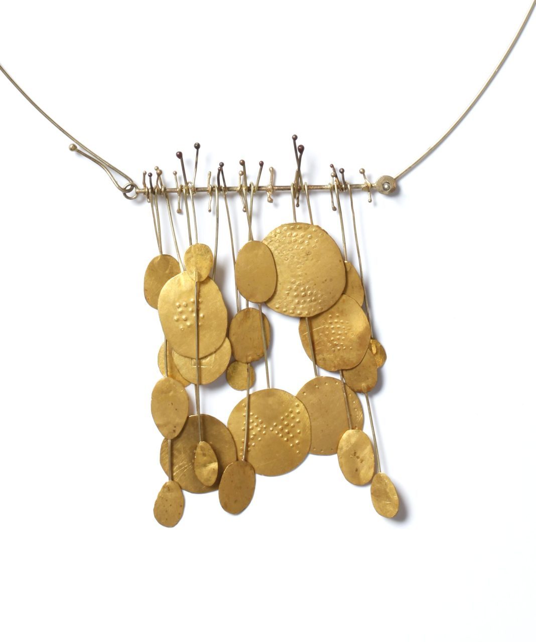 Die Gold-Plättchen sind nicht fest an den Gold-Drähten befestigt. Deshalb bewegen sich die Goldplättchen bei jeder Bewegung des Halsschmucks. Die Goldplättchen berühren sich dabei manchmal und machen ein Geräusch. Der Halsschmuck sieht immer anders aus, weil sich die Goldplättchen bewegen können. Das macht den Hals-Schmuck besonders.