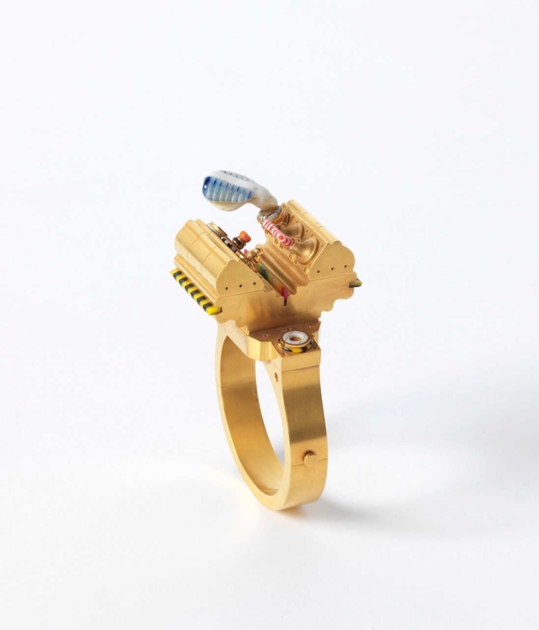 Die Schmuckarbeiten von Claus Bury (*1946) zeigen exemplarisch, dass der sich nach dem Zweiten Weltkrieg entwickelnde Autorenschmuck als eigenständige Kunstform verstanden werden muss. Bury hat an den Schmuckzentren Pforzheim und Hanau eine umfassende Ausbildung zum Goldschmied erfahren. Hierauf aufbauend entwickelte er ein für sich stehendes künstlerisches Werk. Für seine Objekte verwendete er Anfang der 1970er-Jahre farbige Acrylplatten, die er zu feinsten Teilen zuschnitt, miteinander zu Farbkompositionen verklebte und in einen technoiden Korpus aus Gold einfügte. Ihm gelangen hierdurch Schmuckstücke mit einer starken Allansichtigkeit, deren Bedeutung nicht allein durch ihren Materialwert bemessen werden kann und soll, sondern durch ihre visuelle Wirkung. Zu Zeiten von Pop- und Op-Art mochte diese Methodik – die Wahl eines profanen Materials, die bunte Farbigkeit, die von der Industriekultur geprägte Form, das Spiel mit dem Blick – nicht überraschen, doch im Bereich des Schmucks erschloss Bury mit seinen Objekten neue Wege. Seine Arbeiten zeichnen sich durch Bildhaftigkeit – erreicht durch den geschickten Einsatz des Acrylglases – und die skulpturale Behandlung der Form aus. Ende der 1970er-Jahre hat Bury den Schmuck zugunsten der Bildhauerei aufgegeben; ein Beleg dafür, dass eine Beurteilung seiner Objekte unter künstlerischen Gesichtspunkten zwingend ist.