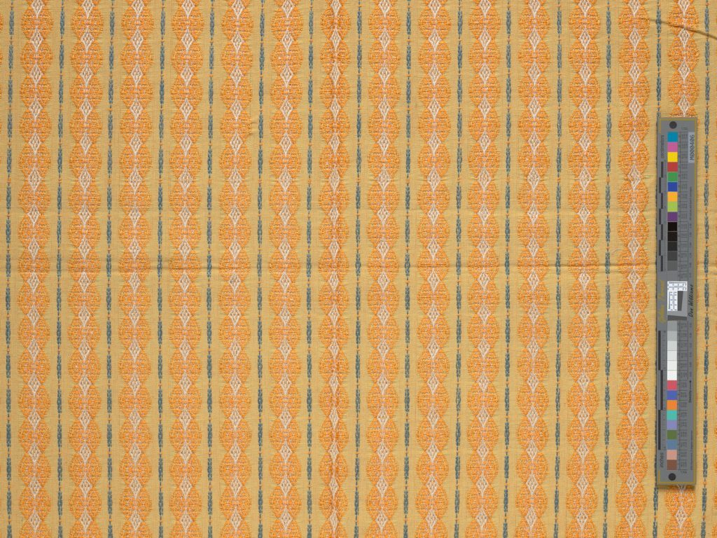 | Material / Technik | Jacquard-Gewebe; Baumwolle, Wolle; Leinwand- und Atlasbindung; Grundkette: Gelb, Bindekette: Weiß und Blau, Schuss: Orange. 1 Webkante, 1 geschnittene unversäuberte Kante, 2 knapp gesäumte Kanten |