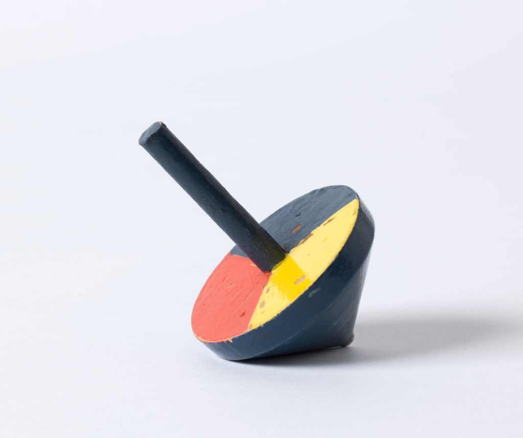 Im Kontext eines Farbenseminars, das Ludwig Hirschfeld-Mack (1893–1965) am Bauhaus initiierte, überlegte er, wie er die Gesetzmäßigkeiten optischer Farbmischung anderen Menschen einfach nahebringen könnte und entwickelte einen Kreisel mit unterschiedlichen Farbflächen. Beim Rotieren des Kreisels entsteht der Eindruck von Farbmischungen, die sich je nach Geschwindigkeit in Verteilung und Intensität verändern. Hirschfeld-Mack gestaltete zwei Versionen des Kreisels. Für Lehrzwecke konnten verschiedenfarbige Scheiben auf den Kreisel aufgesteckt werden. In der Version als Spielzeug für Kinder konnten dagegen einfarbige, exzentrisch gelochte Glanzpapierringe in Gelb, Blau und Rot übereinander auf den Kreisel gelegt werden. Wurde beispielsweise ein blauer Ring auf einen gelben Ring gelegt, mischten sich die Farben auf der ausgesparten Fläche des unteren Rings zu Violett. So lernten Kinder spielerisch, wie aus verschiedenen Farben neue Farbmischungen entstehen. Der Kreisel gehörte zu den erfolgreichsten Spielzeugobjekten der Bauhauswerkstätten. Es haben sich aber nur wenige erhalten, da viele beim Spielen verschlissen. Aufgrund seiner Funktionalität, seiner Gestaltung und der Eignung für die industrielle Produktion stellte Walter Gropius (1883-1969) den Farbkreisel in einem der ersten Bauhausbücher 1925 als mustergültiges Spielzeug vor. Die Neue Sammlung konnte bereits 1926 drei Versionen dieses Kreisels wohl direkt am Bauhaus in Dessau erwerben (Inv.-Nr. 379/26 u. 381/26). Sie unterscheiden sich in ihrer Größe. Dieser blaue Kreisel entspricht der mittleren Größe.