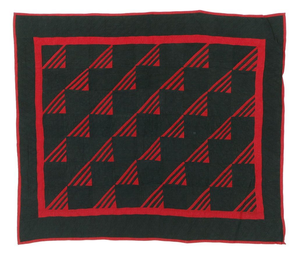 Die Quilts der Amish People – einer ursprünglich aus Europa stammenden religiösen Gemeinschaft, die bis zum heutigen Tag den technischen Fortschritt ablehnt – bilden innerhalb der Textilkunst eine singuläre Erscheinung. Die weltabgewandte Lebensweise der Amischen, ihr Streben nach Einfachheit und Ordnung bedingen die seit der zweiten Hälfte des 19. Jahrhunderts entstandenen Textilarbeiten, die sich durch eine rigorose Abstraktion und eine kühne Farbwahl auszeichnen. Sie sind der symbolisch aufgeladenen und oftmals narrativen europäischen Kunst diametral entgegengesetzt. Ausgangspunkt ist ein enges Repertoire an Mustern aus geometrischen Grundelementen, das aus meist monochromen Stoffzuschnitten zusammengesetzt wird. So entstehen mit einfachen Mitteln und strengen Regeln folgend mit Hand gefertigte Objekte, die einen ausgeprägten Stilwillen erkennen lassen. Üblicherweise in den auf jeden Schmuck verzichtenden und meist nur spärlich beheizten Wohnhäusern als Bettdecken eingesetzt, versinnbildlichen die ebenso komplex wie reduziert wirkenden Quilts die Suche der Amischen nach dem Elementaren. Bei dem in der Neuen Sammlung beheimateten Stück handelt es sich um ein besonders frühes Beispiel der herausragenden Kunst der heute in den USA und Kanada angesiedelten Glaubensgemeinschaft.