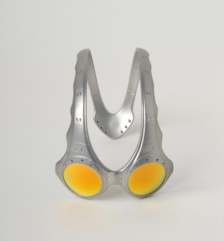 Material / Technik | Kunststoff, silberfarben, gelb verspiegelt; Schaumstoff (Rückseite) |