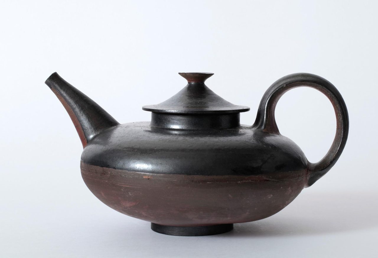 An der Teekanne des Keramikers Otto Lindig (1895–1966) von 1924 ist die Kombination weniger stereometrischer Grundelemente als Gestaltungsprinzip klar zu erkennen. Der gebauchte Gefäßkörper hat die Form einer flachgedrückten Kugel, Aufsatzdeckel und Knauf sind jeweils kegelförmig gestaltet. Der Korpus wurde aus zwei frei gedrehten Hälften zusammengesetzt, die nur auf Deckel und Gefäßoberseite aufgetragene mattschwarze Glasur unterstreicht die geometrisch-skulpturale Wirkung der Kanne. In der Klassik Stiftung Weimar befindet sich eine Variante (L 70) dieser Kanne, weitere Ausführungen sind nicht bekannt. Zu einem Preis von 7,50 RM wurde diese Teekanne 1925 in der Nürnberger Ausstellung „Neues Deutsches Kunsthandwerk“ angekauft, ebenso wie das Sahnekännchen (Inv.-Nr. 44/25), die Kakao- oder Kaffeekanne (L 15, Inv.-Nr. 43/25), eine Zuckerdose (Inv.-Nr. 45/25) und ein heute leider nicht mehr vorhandener Aschenbecher.
