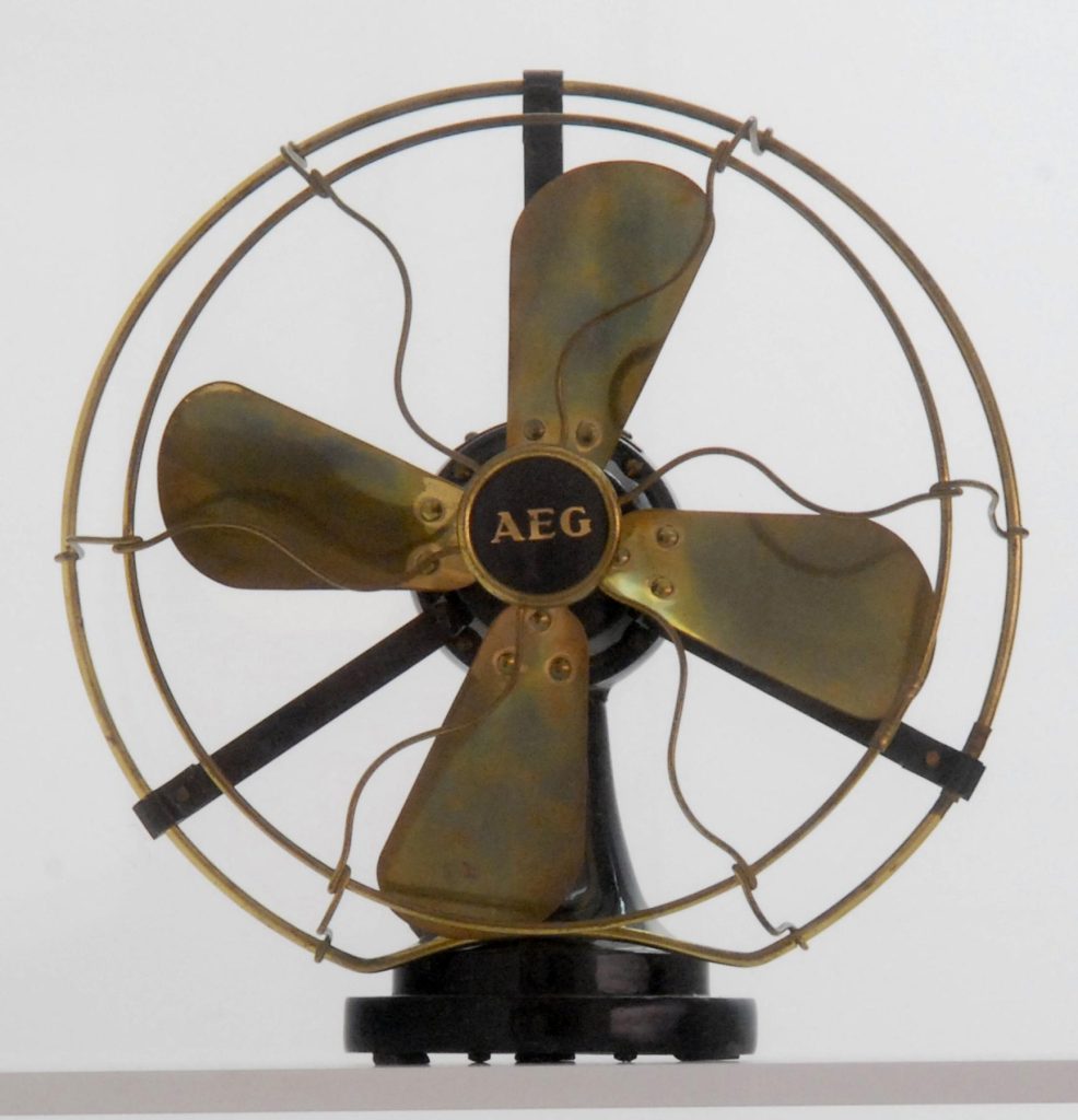 Um 1912 entwarf Peter Behrens einen vierflügeligen, auf festem Fuß stehenden Tischventilator, der von der AEG in Berlin produziert wurde. Gitter und Rotorblätter bestehen aus poliertem Messing, das Metallgehäuse ist schwarz lackiert.