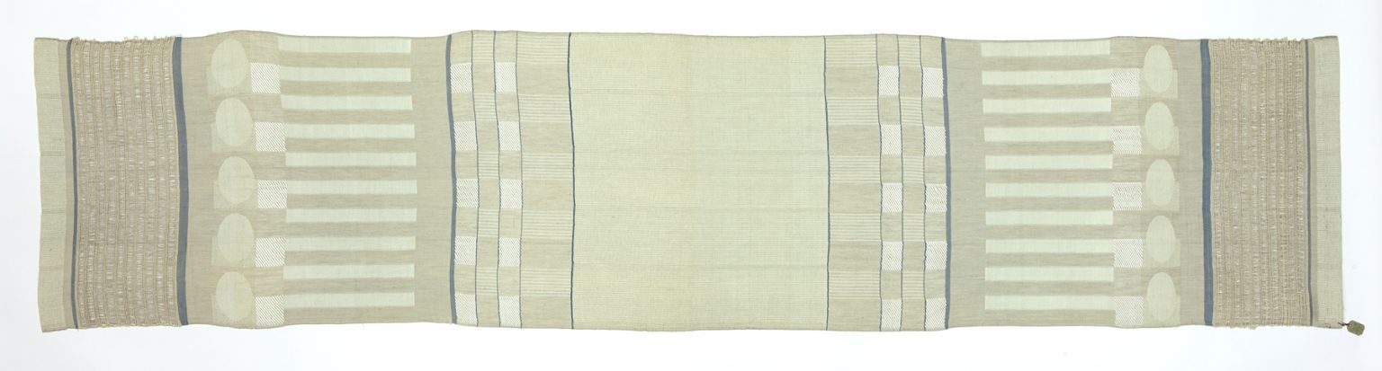 Nach dem Umzug des Bauhauses von Weimar nach Dessau war die Weberei zunächst provisorisch in einem ehemaligen Versandhaus untergebracht, da das neue Werkstattgebäude erst im Oktober 1926 fertiggestellt werden konnte. Gunta Stölzl (1897-1983) wurde dort zuerst als Werkmeisterin verpflichtet und später ab 1927 alleinige Leiterin der Weberei. Die Neue Sammlung erwarb vermutlich bereits im Oktober 1926 die ersten beiden Textilien Stölzls: den hier vorliegenden Wandbehang Nr. 186a und den Läufer Nr. 201 (Inv.-Nr. 366/26). Beide zeichnen sich durch eine reduzierte Farbpalette aus, die auf Weiß-, Grau-, Beige- und Blautöne beschränkt ist. In den Mustern unterscheiden sich die beiden Webarbeiten jedoch auffallend: Den Läufer Nr. 201 dominieren unterschiedlich breite Horizontalstreifen, die zum Teil ineinander versetzt sind, wohingegen der Wandbehang Nr. 186a deutlich abwechslungsreicher gemustert ist. Hier arbeitet Stölzl mit verschieden breiten Querzonen mit horizontalen und vertikalen Streifen, Karo- und Ovalformen, die mit dunkleren unterschiedlich feinen durchgängigen Linien akzentuiert werden.