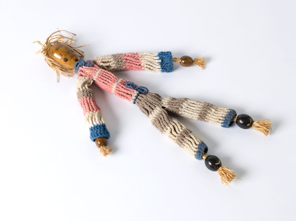 Die Wurfpuppe der Entwerferin Alma Siedhoff-Buscher (1899–1944) ist das einzige Bauhaus-Produkt, das je beim Deutschen Patentamt angemeldet wurde und das Deutsche Reichspatent auch erhalten hat. Im Eintrag von 1926 heißt es: „Die Erfindung richtet sich auf die besondere Fertigung und Gestaltung aus zopfartigem Geflecht [...]. Die neue Puppe zeichnet sich insbesondere durch ihre Beweglichkeit und Unverwüstlichkeit aus.“ Der neuartige Gebrauch des Werfens der Puppe erforderte eine besondere Robustheit der Materialien: Der langgliedrige Körper und die Haare bestehen aus Bast; Kopf, Hände und Füße aus gedrechselten und bemalten Holzkugeln. Die Kleidung wurde um die Bastfigur aus Baumwoll-Chenille gehäkelt. Im Gegensatz zu damals gängigem Spielzeug ist die Wurfpuppe nicht steif und zerbrechlich, sondern weich und beweglich. Sie kann beliebig gelegt oder als Zufallsfigur auf den Boden geworfen werden. Damit wird das Puppenspiel von vorgegebenen Spielmustern befreit und die kreative Entfaltung des Kindes gefördert. Das Hin- und Herwerfen der Puppe in der Gemeinschaft sollte außerdem die Motorik der Kinder schulen. Die Neue Sammlung konnte bereits 1926 zwei Modelle dieser Wurfpuppen erwerben. Sie unterscheiden sich in der Farbigkeit ihrer Kleidung und im Gesichtsausdruck. Neben dieser Ausführung mit blauen und rosafarbenen Streifen befindet sich noch eine weitere mit vorwiegend grüner Oberbekleidung und gelben Streifen (Inv.-Nr. 529/26) in der Sammlung.